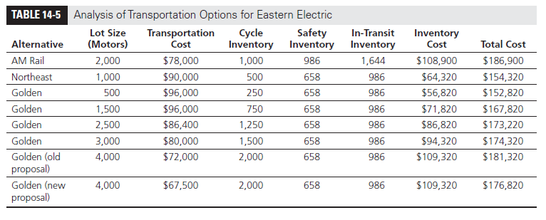 Golden’s new proposal will result in low transportation costs for EE if the plant manager orders in lots of 4,000 motors. The plant manager, however, decides to include inventory costs in the transportation decision. EE’s annual cost of holding inventory is 25 percent, which implies an annual holding cost of H = $120 X 0.25 = $30 per motor. Shipments by rail require a five-day transit time, whereas shipments by truck have a transit time of three days. The transportation decision affects the cycle inventory, safety inventory, and in-transit inventory for EE. Therefore, the plant manager decides to evaluate the total transportation and inventory cost for each transportation option.