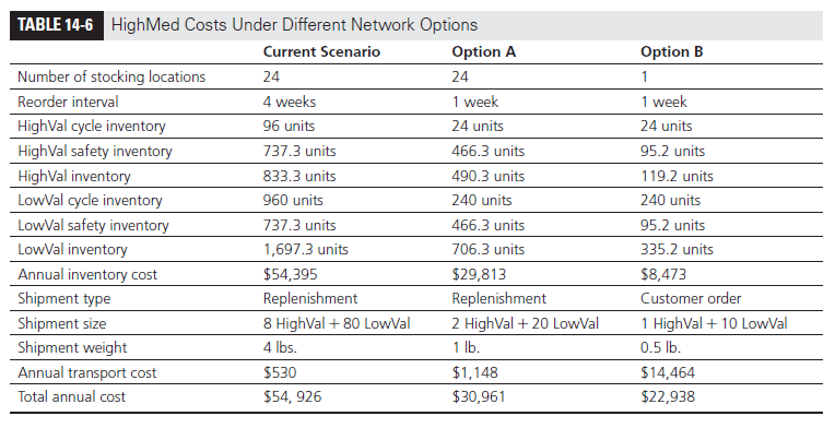 From Table 14-6, observe that increasing the replenishment frequency under Option A decreases total cost at HighMed. The increase in transportation cost is much smaller than the decrease in inventory cost resulting from smaller lots. HighMed is able to reduce total cost most by aggregating all inventories and using FedEx for transportation, because the decrease in inventories upon aggregation is larger than the increase in transportation cost.