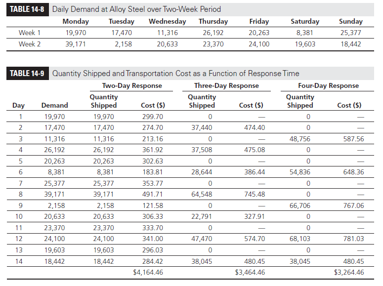 As the response time increases, Alloy Steel has the opportunity to aggregate demand over multiple days for shipping. For a response time of three days, Alloy Steel can aggregate demand over two successive days before shipping. For a response time of four days, Alloy Steel can aggregate demand over three days before shipping. The manager evaluates the quantity shipped and transportation costs for different response times over the two-week period, as shown in Table 14-9 (see worksheet Example14-4).