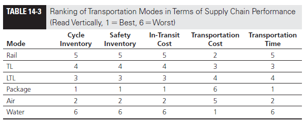 The impact of using different modes of transportation on inventories, response time, and costs in the supply chain is shown in Table 14-3. Each transportation mode is ranked along various dimensions, with 1 being the best and 6 being the worst.