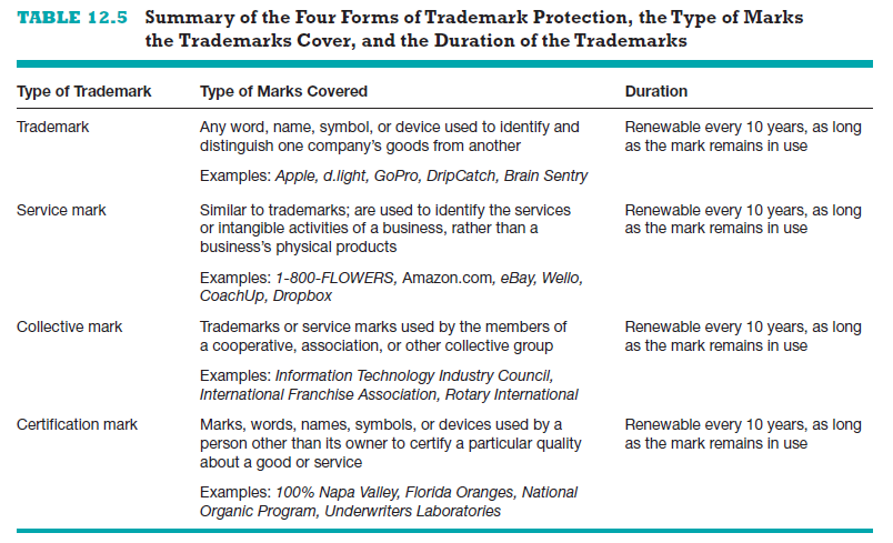 There are four types of trademarks: trademarks, service marks, collective marks, and certification marks (see Table 12.5). Trademarks and service marks are of the greatest interest to entrepreneurs.