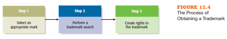 As illustrated in Figure 12.4, selecting and registering a trademark is a three- step process. Once a trademark has been used in interstate commerce, it can be registered with the USPTO. It can remain registered forever as long as the trademark stays in use. The first renewal is between the fifth and the sixth year following the year of initial registration. It can be renewed every 10 years thereafter, as long as the trademark stays in use.