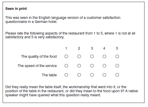 For all of these reasons initial translations should be carried out by people who understand the research process and the importance of capturing the sentiment rather than a literal translation. Oppenheim (1992) quotes the case where a question asking whether a house had ‘running water’, although translated literally into other languages, was taken in some countries to mean having a stream or river running through the house. Wright and Crimp (2000) quote how ‘out of sight, out of mind’ became ‘invisible, insane’ in Mandarin Chinese.