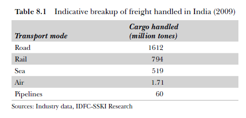 In India, 65 per cent of the total domestics cargo movement is done through road; followed by rails, which contributes to the extent of 35 per cent; balance shared by inland water, air and sea. Table 8.1 indicates the cargo handled through each mode.