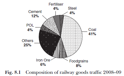 Indian Railways (IR) is operating through a network of 6896 railway stations across 63320 kilometres of route length with the route density of 138 kilometre per 1000 m2 of area. Of this 49800 kilometre is covered by broad gauge lines, which account for 85 per cent cargo movement by rail. The goods movement is done through 2,53,186 wagons having the total carrying capacity of 10.6 million tonnes. IR’s 96 per cent cargo consists of bulk items such as coal, iron ore, cement, fertilizers, raw materials for steel plants, finished steel products and petroleum. Bulk cargo is transported through railways because of cost advantage over other modes. In 2008-09, Indian railways handled 833.4 million tonnes of freight traffic on the above network. Figure 8.1 shows the contribution of various items in total cargo handled by railways in the year 2008-09.