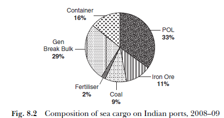 In India, 11 major ports handle 95 per cent of international trade and 85 per cent of domestic sea trade. Indian ports handled around 272 million tonnes of both domestic and international cargo in 2000-01 through 11 major and 117 small ports. This sector will continue to play a major role in the Indian economy as India’s export is likely to grow by 15 per cent and imports by 14 per cent. There will be major imports of Petroleum Oil and Lubricants (POL), Liquified Natural Gas (LNG), and Liquified Petroleum Gas (LPG) in the near future and these will require better storage and handling facilities at the Indian ports (Figure 8.2).