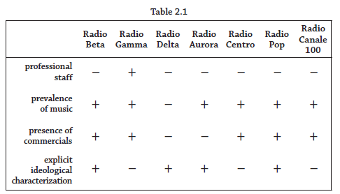 This table tells me that a nonprofessional, ideologically explicit group runs Radio Pop, that the station broadcasts more music than speech, and that it accepts commercials. It also tells me that the presence of commercials and the abundant music content are not necessarily in contrast with the station’s ideology, since we find two radio stations with similar characteristics, and only one ideological station that broadcasts more speech than music. On the other hand, the presence of commercials and abundant music characterize all nonideological stations. And so on. This table is purely hypothetical and considers only a few parameters and a few stations. Therefore it does not allow us to draw reliable statistical conclusions, and it is only a suggested starting point.