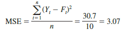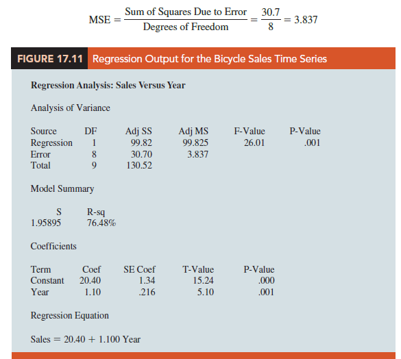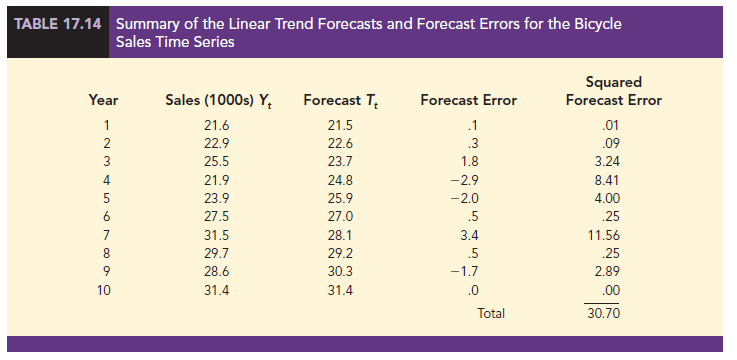 To compute the accuracy associated with the trend projection forecasting method, we will use the MSE. Table 17.14 shows the computation of the sum of squared errors for the bicycle sales time series. Thus, for the bicycle sales time series,
