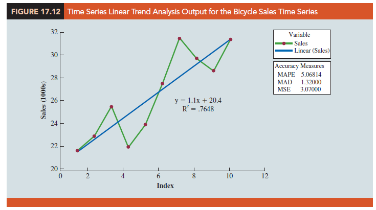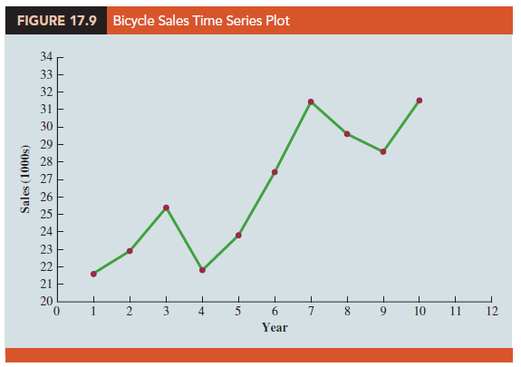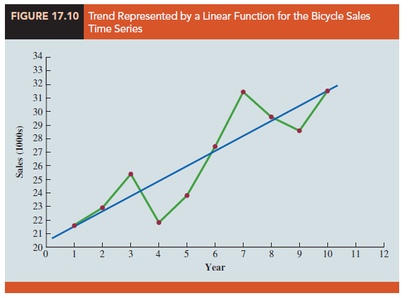 Although the time series plot in Figure 17.9 shows some up and down movement over the past 10 years, we might agree that the linear trend line shown in Figure 17.10 provides a reasonable approximation of the long-run movement in the series. We can use the methods of simple linear regression to develop such a linear trend line for the bicycle sales time series.