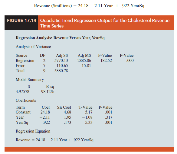 A standard linear regression procedure can be used to compute the values of b0, b1, and b2. There are two independent variables, year and year squared, and the dependent variable is the sales revenue in millions of dollars. Thus, the first observation is 1, 1, 23.1; the second observation is 2, 4, 21.3; the third observation is 3, 9, 27.4; and so on. Figure 17.14 shows a portion of the multiple regression output for the quadratic trend model; the estimated regression equation is