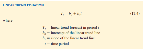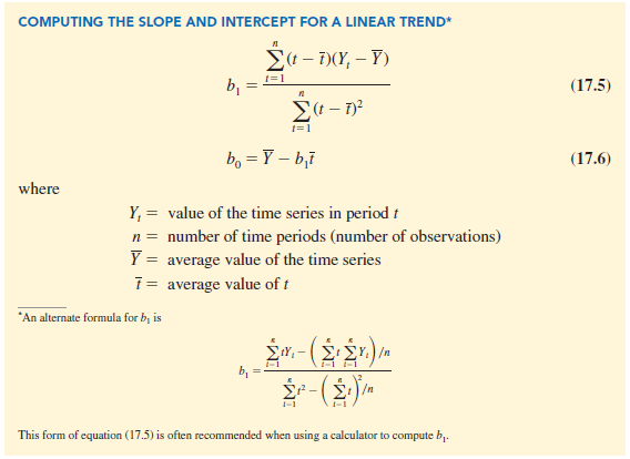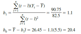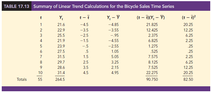 Using these values, and the information in Table 17.13, we can compute the slope and intercept of the trend line for the bicycle sales time series.