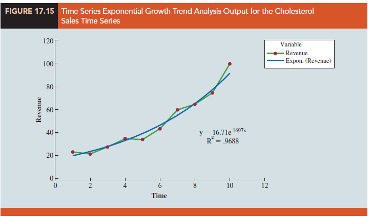 Figure 17.15 shows the graphical output of an exponential trend equation based on equation (17.8) for the Cholesterol sales data.