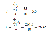 Thus, for the bicycle sales time series t = 1 corresponds to the oldest time series value and t = 10 corresponds to the most recent year. Formulas for computing the estimated regression coefficients (b1 and b0) in equation (17.4) follow.