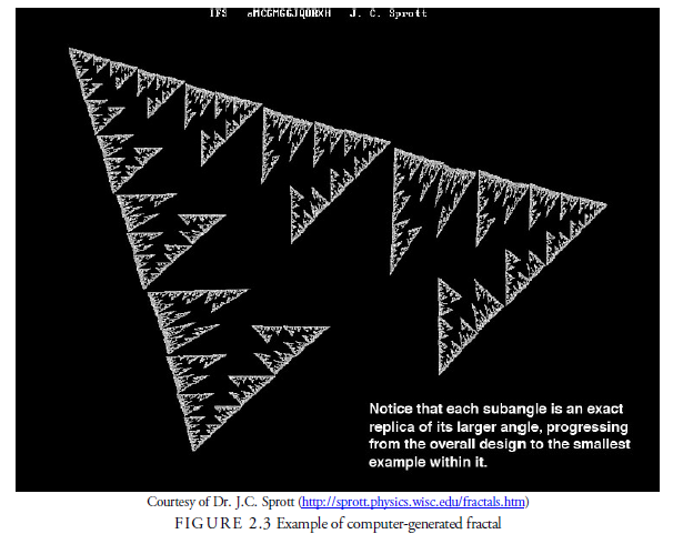 The number of trend lengths is unlimited. Investors and traders need to determine which length they are most interested in, but the methods of determining when a trend begins and ends are the same regardless of length. This ability for trends to act similarly over different periods is called their fractal nature. Fractal patterns or trends exist in nature along shorelines, in snowflakes, and elsewhere. For example, a snowflake is always six-sided—having six branches, if you will. Each branch has a particular, unique pattern made of smaller branches. Using a microscope to look closely at the snowflake, we see that the smaller branches off each larger branch have the same form as the larger branch. This same shape carries to even smaller and smaller branches, each of which has the same pattern as the next larger. This is the fractal nature of snowflakes. The branches, regardless of size, maintain the same pattern. Figure 2.3 shows a computer-generated fractal with each subangle an exact replica of the next larger angle.