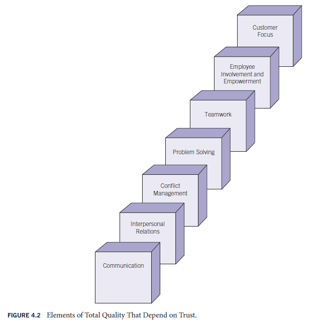 The total quality approach cannot be successfully implemented in an organization that fails to subscribe to high standards of ethical behavior. This is because ethical behavior builds trust, and trust is an essential ingredient in total quality. Consider the various elements of total quality that depend on trust: communication, interpersonal relations, conflict management, problem solving, teamwork, employee involvement and empowerment, and customer focus (see Figure 4.2).