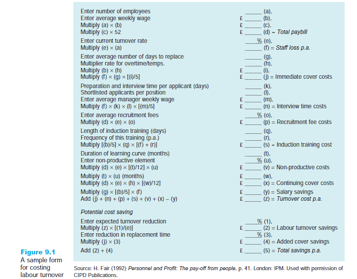 When deciding what kind of measures to put in place in order to improve staff retention generally or the retention of particular individuals, organisations need to balance the costs involved against those that are incurred as a direct result of voluntary resignations. Although it is difficult to cost turnover accurately, it is possible to reach a fair estimate by taking into account the range of expenses involved in replacing one individual with another. Once a figure has been calculated for a job, it is relatively straightforward to compute the savings to be gained from a given percentage reduction in annual turnover rates. Figure 9.1 shows the approach to turnover costing recommended by Hugo Fair (1992).