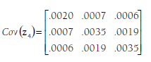 After computing effect size (zj), indicator (Xj), and estimation variance/cova- riance (Cov(zj)) matrices for each study (i), you then create three large matrices that combine these matrices across the individual studies. The first of these is z, which is a column vector of all of the individual effect sizes vectors from the studies (zjs) stacked. In the example from Table 12.1, this vector would be: