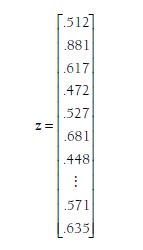 The first three values of this vector (.512, .881, and .617) are the Zrs from the single effect sizes provided by the first three studies (Andreou, 2006; Arnold, 1998; and Berdugo-Arstark, 2002 from Table 12.1). The next three values (.472, .527, and .681) are the three Zrs from the fourth study (Blach- man, 2003), which provided three effect sizes. The next value (.448) is the single Zr from the fifth study (Brendgen et al., 2005). I have omitted the values of this matrix until the last (38th) study (Zalecki & Hinshaw, 2004), which provided two effect sizes (Zrs = .571 and .635). In total, this z vector has 76 rows (i.e., a 76 X 1 matrix) that contain the 76 effect sizes from these 38 studies.