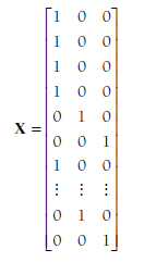 The second large matrix is X, which is a stacked matrix of the indicator matrices of the individual studies (Xj). Because all of the study indicator matrices had three columns, this matrix also has three columns. However, each study provides a number of rows to this matrix equal to the number of effect sizes; therefore there will be 76 rows in the X matrix in the example. Specifically, this matrix will look as follows: