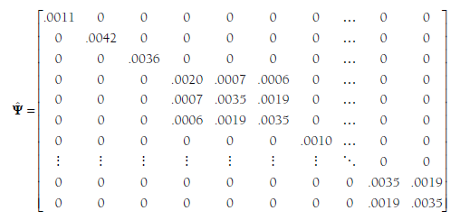 Here, the first three elements along the diagonal represent the variances of the estimates of the single effect sizes provided by these three studies. The next study is represented in the square starting in cell 4, 4 (fourth row, fourth column) to cell 6, 6. These values represent the variances and covariances among estimates of the three effect sizes from this study, which were shown above as Cov(z4). The variance of the single effect size of study 5 is shown next along the diagonal. I have again omitted the remaining values until the last (38th) study (Zalecki & Hinshaw, 2004). This study provided two effect sizes, and the variances (both .0035) and covariance (.0019) of these estimates are shown as a square matrix around the diagonal. Note that all other values in this matrix are 0. In total, this F matrix is a square, symmetric matrix with 76 (total number of effect sizes in this example) rows and columns.