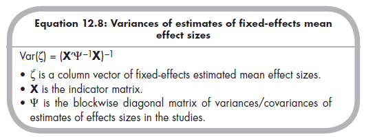 These three matrices, z, X, and, F are then used to estimate (via generalized least squares methods) fixed-effects mean effect sizes, which are contained in the column vector £. The equation to do so is somewhat daunting looking, but is a relatively simple matter of matrix algebra (Becker, 2009, p. 389):