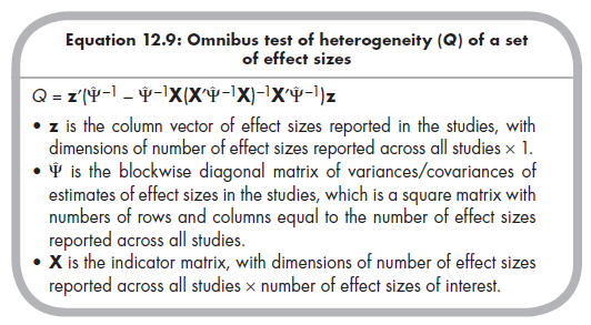 Just as when you are analyzing a single effect size, the appropriateness of a fixed-effects model depends on whether effect sizes are homogeneous versus heterogeneous. If they are heterogeneous, then you should use a random- effects model (see Chapter 10), which precludes the MASEM approach (Cheung & Chan, 2005a). The test of heterogeneity in the multivariate case is an omnibus test of whether any of the effect sizes significantly vary across studies (more than expected by sampling fluctuation alone; see Chapter 8). Becker (2009) described a significance test that relies on a Q value as in the univariate case, but here this value must be obtained through matrix algebra using the following equation (Becker, 2009, p. 389):