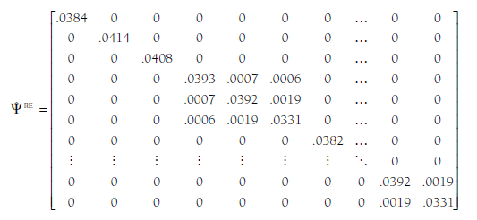 Comparison of the values in this matrix relative to those in the fixed- effects F is useful. Here we see that the first value on the diagonal (for the first study, Andreou, 2006) is .0384, which is the sum of t2 (.0372) for the effect size indexed by this value (relational-overt) and the study-specific variance of this estimate from the fixed-effects matrix (.0011) (note that rounding error might produce small discrepancies). Similarly, the second value on the diagonal is for the second study, which also provided an effect size of the relational-overt association, and this value (.0414) is the sum of the same t2 (.0372) as Study 1 (because they both report relational-overt effect sizes) plus that study’s sample-size specific variance of sampling error from the fixed-effects matrix (.0042). Consider next the fourth through sixth values on the diagonal, which are for the three effect sizes from Study 4 (Blachman, 2003). The first value (.0393) is for the relational-overt effect size estimate, which is the sum of the t2 for that effect size (.0372) plus the sampling variance for this study and this effect size (.0020). The second value for this study is .0392, which is the sum of the t2 for the relational- rejection effect size (.0357) and the sampling variance for this study and this effect size found in the parallel cell of the fixed-effects matrix OF), .0035. The third value for this study (.0331) is similarly the sum of the t2 for the overt-rejection effect size (.0296) and sampling variance (.0035). Note that the off-diagonal elements (covariances of effect size estimates) do not change in this approach because we have assumed no between-study covariance of population effect sizes.