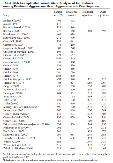To illustrate these approaches, I expand on the example described earlier in the book. Table 12.1 summarizes 38 studies that provide correlations among relational aggression (e.g., gossiping), overt aggression (e.g., hitting), and peer rejection.10 Here, 16 studies provide all three correlations among these variables, 6 provide correlations of both relational and overt aggression to peer rejection, and 16 provide the correlation between overt and relational aggression. This particular example is somewhat artificial, in that (1) a selection criterion for studies in this review was that results be reported for both relational and overt forms of aggression (otherwise, there would not be perfect overlap in the correlations of these two forms with peer rejection), and (2) for simplicity of presentation, I selected only the first 16 studies, out of 82 studies in the full meta-analysis, that provided only the overt with relational aggression correlation. Nevertheless, the example is realistic in that the three correlations come from different subsets of studies, and contain different numbers of studies and participants (for rrelational-overt, k = 32, N = 11,642; for rrelational-rejection