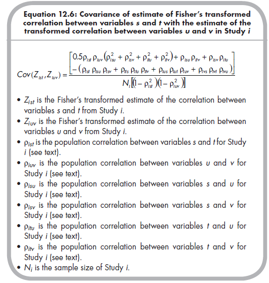 Just as it was necessary to compute the standard errors of study effect size estimates in all meta-analyses (see Chapters 5 and 8), we must do so in this approach to multivariate meta-analysis. Here, I describe the variances of estimates of effect sizes, which is simply the standard error squared: Var(Zr) = SEzr2. So the variances of each Zr effect size are simply 1 / (N; – 3). However, for a multivariate meta-analysis, in which multiple effect sizes are considered, you must consider not only the variance of estimate of each effect size, but also the covariances among these estimates (i.e., the uncertainty of estimation of one effect size is associated with the uncertainty of estimation of another effect size within the same study). The covariance of the estimate of the Fisher’s transformed correlation between variables s and t with the estimate of the transformed correlation between variables u and v (where u or v could equal s or t) from Study i is computed from the following equation (Becker, 1992, p. 343; Beretvas & Furlow, 2006, p. 161)12: