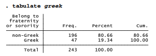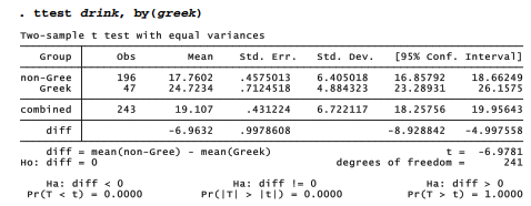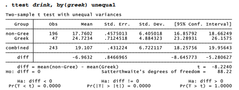 As the output notes, this t test rests on an equal-variances assumption. But the fraternity and sorority members’ sample standard deviation appears somewhat lower — they are more alike than nonmembers in their reported drinking behavior. To perform a similar test without assuming equal variances, add the option unequal: