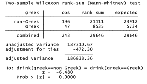 Adjusting for unequal variances does not alter our basic conclusion that Greeks (fraternity/sorority members) and non-Greeks are significantly different. We can further check this conclusion by trying a nonparametric Mann-Whitney U test, also known as a Wilcoxon rank-sum test. Assuming that the rank distributions have similar shape, the rank-sum test indicates that we can reject the null hypothesis of equal population medians.