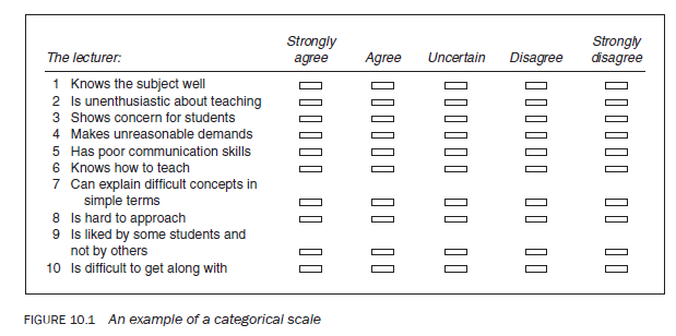 The summated rating scale, more commonly known as the Likert scale, is based upon the assumption that each statement/item on the scale has equal attitudinal value, ‘importance’ or ‘weight’ in terms of reflecting an attitude towards the issue in question. This assumption is also the main limitation of this scale as statements on a scale seldom have equal attitudinal value. For instance, in the examples in Figures 10.1 and 10.2, ‘knowledge of subject’ is not as important in terms of the degree to which it reflects the attitude of the students towards the lecturer as ‘has published a great deal’ or ‘some students like, some do not’, but, on the Likert scale, each is treated as having the same ‘weight’. A student may not bother much about whether a lecturer has published a great deal, but may be more concerned about ‘knowledge of the subject’, ‘communicates well’ and ‘knows how to teach’.