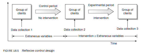 - Reflexive control design – To overcome the problem of comparability in different groups, sometimes researchers treat data collected during the non-intervention period to represent a control group, and information collected after the introduction of the intervention as if it pertained to an experimental group (Figure 18.5).