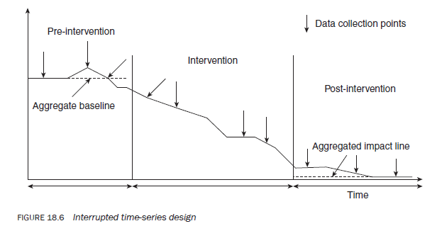 - Interrupted time-series design – In the interrupted time-series design you study a group of people before and after the introduction of an intervention. It is like the before-and-after design, except that you have multiple data collections at different time intervals to constitute an aggregated before-and-after picture (Figure 18.6). The design is based upon the assumption that one set of data is not sufficient to establish, with a reasonable degree of certainty and accuracy, the before-and-after situations.