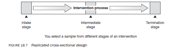 - Replicated cross-sectional design – The replicated cross-sectional design studies clients at different stages of an intervention, and is appropriate for those interventions that take new clients on a continuous or periodic basis. See Figure 18.7. This design is based on the assumption that those who are currently at the termination stage of an intervention are similar in terms of the nature and extent of the problem to those who are currently at the intake stage.