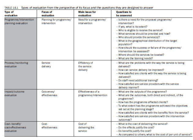 It is important for you to understand the different evaluation questions that each is designed to answer. Table 18.1 will help you to understand the application of each type of evaluation.
