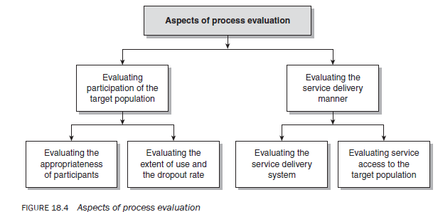 Evaluating the participation of the target population in turn involves: (1) ascertaining the appropriateness of the clients for the service in question; and (2) establishing the total number of clients and the dropout rate among them. Evaluating the service delivery manner, in the same way, includes two tasks: (1) examining the procedures used in providing the service; and (2) examining the issues relating to the accessibility of the service to potential clients (Figure 18.4).