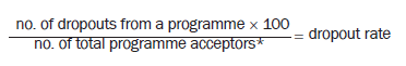 - Percentage of dropouts – The dropout rate from a service is reflective of the satisfaction level of consumers with the programme. A higher rate indicates either inappropriate service content or flaws in the way the service is being delivered: it does not establish whether the problem is with the delivery manner or the intervention content. However, the figure will provide you with an overall indication of the level of satisfaction of consumers with the service: the higher the dropout rate, the higher the level of dissatisfaction, either with the contents of a service (its relevance to the needs of the population) or the way it is being delivered.