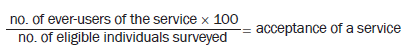 - Survey of the target population – Target population surveys, in addition to providing information about the extent of appropriate use of a service, also provide data on the extent of acceptance of a service among those for whom it was designed. The proportion of people who have accepted an intervention can be calculated as follows: