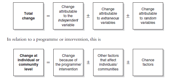 This theory of causality is of particular relevance to impact assessment studies. In determining the impact of an intervention, it is important to realise that the changes produced by an intervention may not be solely because of the intervention. Sometimes, other factors (extraneous variables) may play a more important role than the intervention in bringing about changes in the dependent variable. When you evaluate the effectiveness of an intervention, without comparing it to that of a control group, your findings will include the effects of extraneous variables. If you want to separate out the respective contributions of extraneous variables and the intervention, you need to use a control study design.