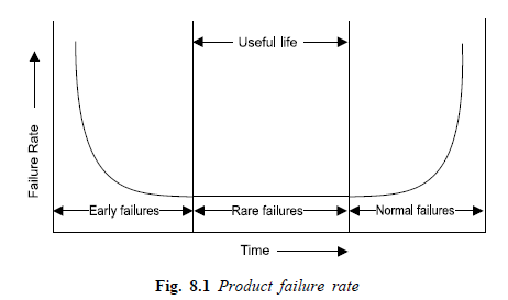 The general failure pattern of any product is given in Fig. 8.1. This is called bath-tub curve. In Fig. 8.1, there will be large number of failures in the early period. This is mainly due to nonalignment while shipping the product, or misfit while manufacturing (assembling), or very high initial friction between moving parts, etc.