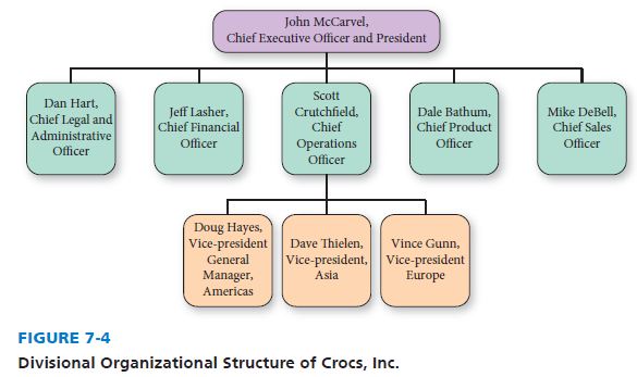 A divisional structure by geographic area is appropriate for organizations whose strategies need to be tailored to fit the particular needs and characteristics of customers in different geographic areas. this type of structure can be most appropriate for organizations that have similar branch facilities located in widely dispersed areas. A divisional structure by geographic area allows local participation in decision making and improved coordination within a region. Due to steady declines in revenues among its U.S. restaurants, McDonald’s recently created a new organizational structure for its operations in the United States, replacing three regions with four geographic zones to better respond to local tastes. McDonald’s U.S. President Mike Andres said, “What has worked for McDonald’s USA for the past decade is not sufficient to propel the business forward in the future.” The footwear maker, Crocs, Inc., also uses the divisional-by-region type of structure, as illustrated in Figure 7-4.