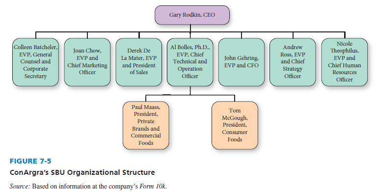 As the number, size, and diversity of divisions in an organization increase, controlling and evaluating divisional operations become increasingly difficult for strategists. Increases in sales often are not accompanied by similar increases in profitability. The span of control becomes too large at top levels of the firm. For example, in a large conglomerate organization composed of 90 divisions, such as ConAgra, the chief executive officer could have difficulty even remembering the first names of divisional presidents. In multidivisional organizations, an SBU structure can greatly facilitate strategy-implementation efforts. ConAgra has put its many divisions into two primary SBUs: (1) consumer foods and (2) private brands and commercial foods. ConAgra’s SBU structure is illustrated in Figure 7-5. Commercial foods are “food for restaurants,” whereas consumer foods are “food in grocery stores.”
