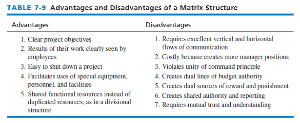 Despite its complexity, the matrix structure is widely used in many industries, including construction, health care, research, and defense. As indicated in table 7-9, some advantages of a matrix structure are that project objectives are clear, there are many channels of communication, workers can see the visible results of their work, shutting down a project can be accomplished relatively easily, and it facilitates the use of specialized personnel, equipment, and facilities. Functional resources are shared in a matrix structure, rather than duplicated as in a divisional structure. Individuals with a high degree of expertise can divide their time as needed among projects, and they in turn develop their own skills and competencies more than in other structures.