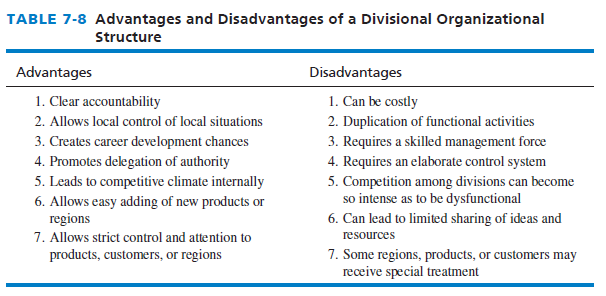 the divisional design is not without some limitations, however. perhaps the most important limitation is that a divisional structure is costly, for a number of reasons. First, each division requires functional specialists who must be paid. Second, there exists some duplication of staff services, facilities, and personnel; for instance, functional specialists are also needed centrally (at headquarters) to coordinate divisional activities. third, managers must be well qualified because the divisional design forces delegation of authority; better-qualified individuals require higher salaries. A divisional structure can also be costly because it requires an elaborate, headquarters- driven control system. Fourth, competition between divisions may become so intense that it is dysfunctional and leads to limited sharing of ideas and resources for the common good of the firm. table 7-8 summarizes the advantages and disadvantages of divisional organizational structure.