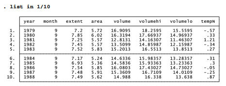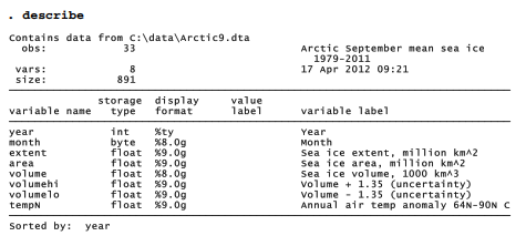 As a preview showing Stata at work, this section retrieves and analyzes a previously-created dataset named Arctic9.dta. This small time series covers satellite-era (1979 to 2011) observations of ice on the Arctic Ocean in September, at the lowest point of its annual cycle. The data come from three different sources (see the appendix on Data Sources). One variable, extent, is a satellite-based measure of the Northern Hemisphere sea area with at least 15% ice concentration each September. Area numbers are somewhat less than extent, representing the area of sea ice itself. Another variable, tempN, describes mean annual surface air temperature above 64°N latitude. Temperatures are expressed as anomalies, which are deviations from the 1951-1980 average, in degrees Celsius. We have 33 observations (years) and 8 variables.