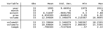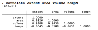 Arctic sea ice extent, area and volume should be related to annual air temperature, not only because warmer air contributes to ice melting but also because surface air temperatures over ice- free seas will be warmer than temperatures over ice. We can see the correlations among variables by typing correlate followed by a list of variables.