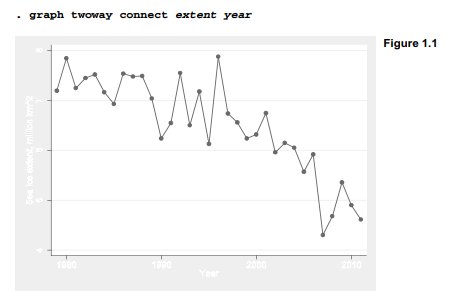 So ice extent, area, volume and temperature all are related. How have they changed over time? Figure 1.1 plots extent against year, produced by the graph twoway connect command. The first-named variable in this command, extent, defines the vertical or y axis; the last-named variable, year, defines the horizontal or x axis. We see an uneven but steepening downward pattern, as September sea ice extent declined by more than a third over this period.