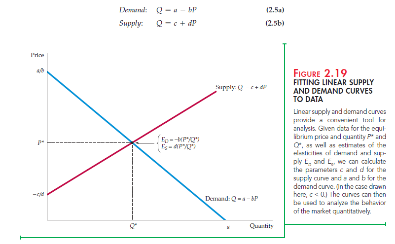 where P* and Q* are the equilibrium price and quantity for which we have data and to which we want to fit the curves. Because we have numbers for ES, Ed, P*, and Q*, we can substitute these numbers in equations (2.6a) and (2.6b) and solve for b and d.