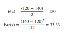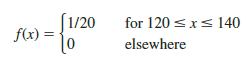Let us make an observation about the graph in Figure 6.2. Consider the area under the graph of f(x) in the interval from 120 to 130. The area is rectangular, and the area of a rectangle is simply the width multiplied by the height. With the width of the interval equal to 130 – 120 = 10 and the height equal to the value of the probability density function f(x) = 1/20, we have area = width X height = 10(1/20) = 10/20 = .50.